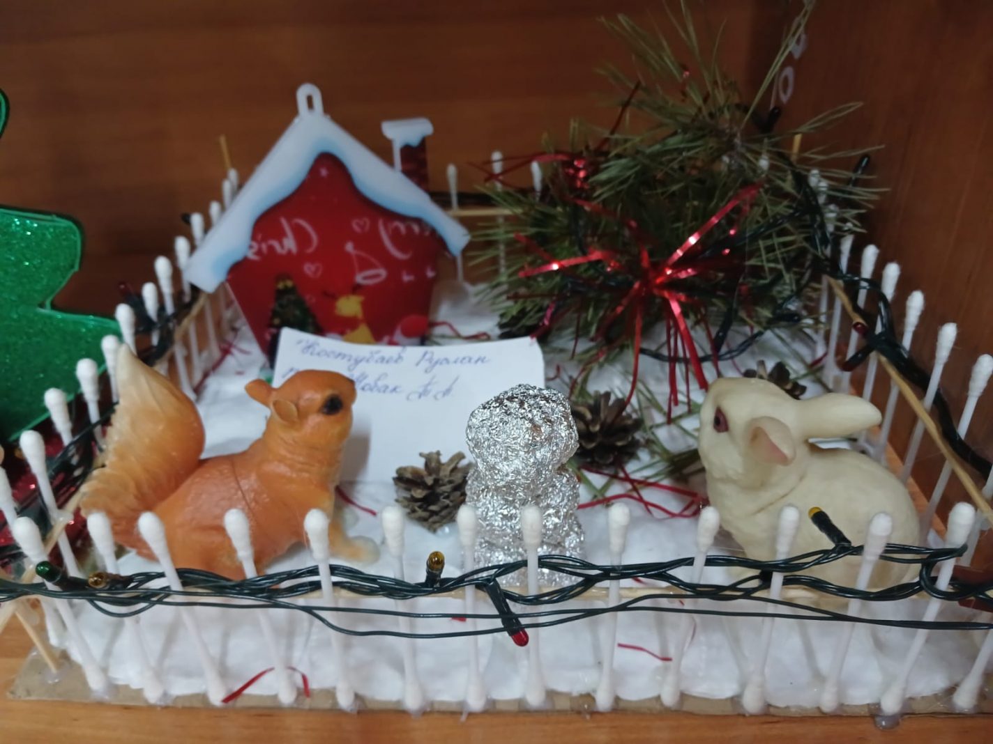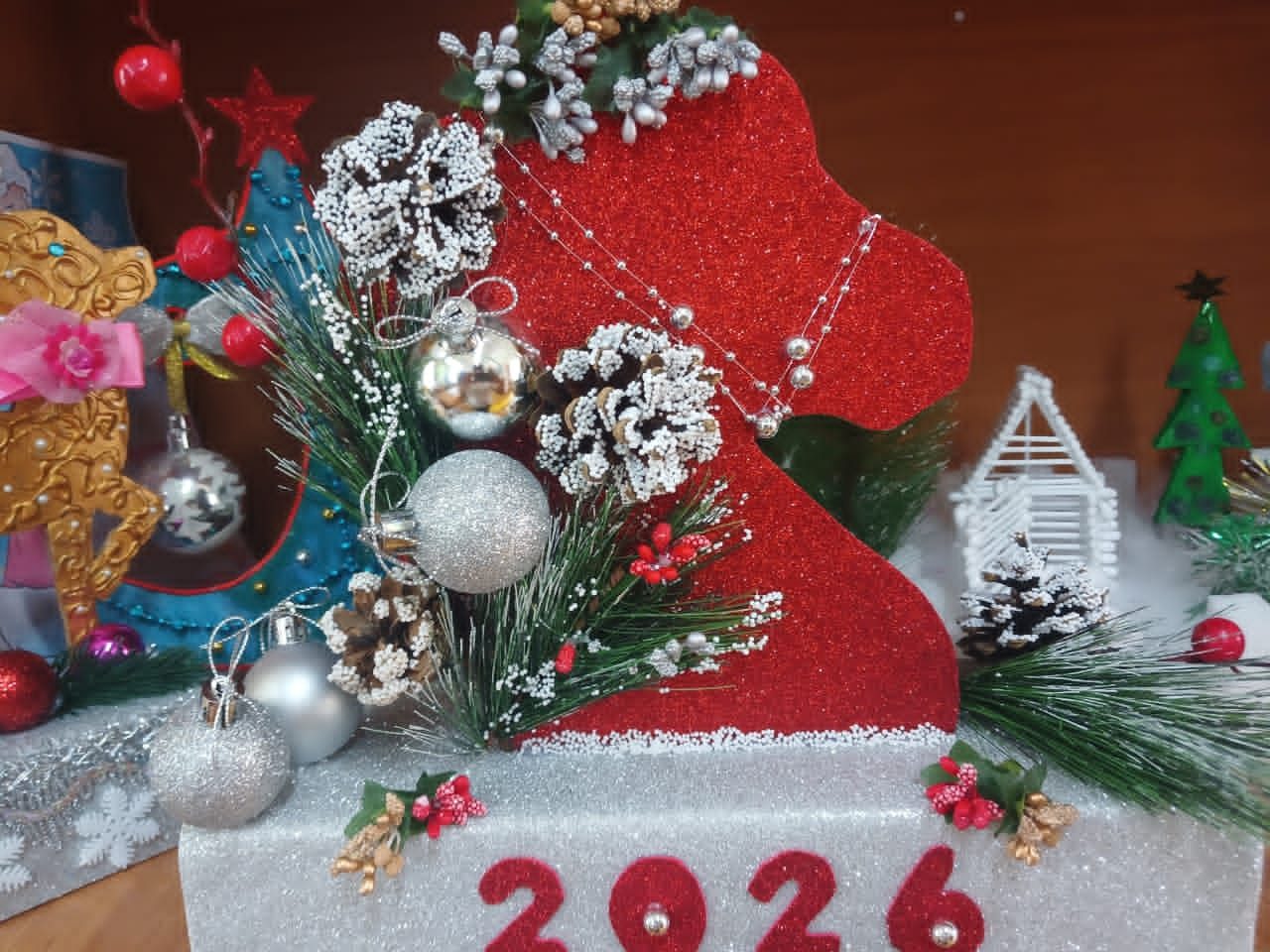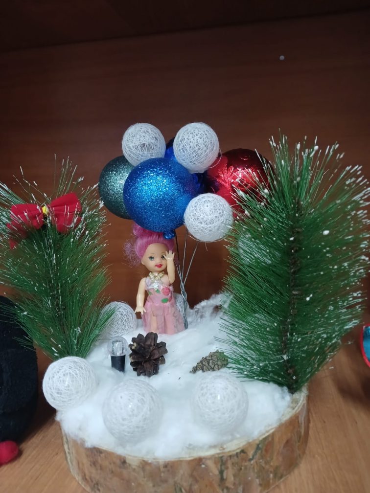 Түрлі шыршалар, көңілді қар адамдары, қар басқан үйлер, әсем ақ марал, тіпті жыл нышаны жылқы да – бәрі балалар мен ата-аналардың қолымен жасалған.