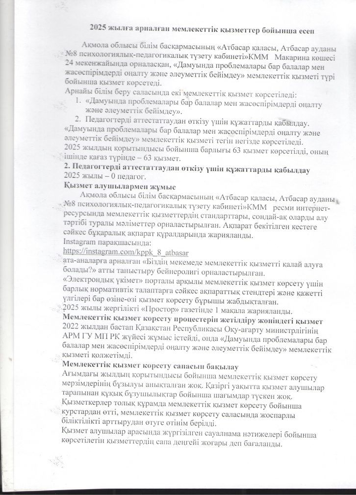 АҚМОЛА ОБЛЫСЫ БІЛІМ БАСҚАРМАСЫНЫҢ "АТБАСАР ҚАЛАСЫ, АТБАСАР АУДАНЫ, №8 ПСИХОЛОГИЯЛЫҚ-ПЕДАГОГИКАЛЫҚ ТҮЗЕТУ КАБИНЕТІ" КОММУНАЛДЫҚ МЕМЛЕКЕТТІК МЕКЕМЕСІ